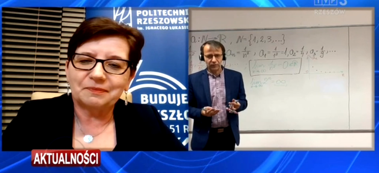 W dniu 7.12.2020 roku Pani Prorektor ds. kształcenia dr hab. Iwona Włoch, prof. PRz była gościem Aktualności TVP Rzeszów o godz.17:30. Rozmowa dotyczyła pilotażowego cyklu lekcji online z matematyki i fizyki, który rozpoczął się na WMiFS przy współpracy z IV LO w Rzeszowie. Pani prorektor opowiedziała w jaki sposób w sytuacji pandemicznej Politechnika Rzeszowska podtrzymuje współpracę ze szkołami w regionie.