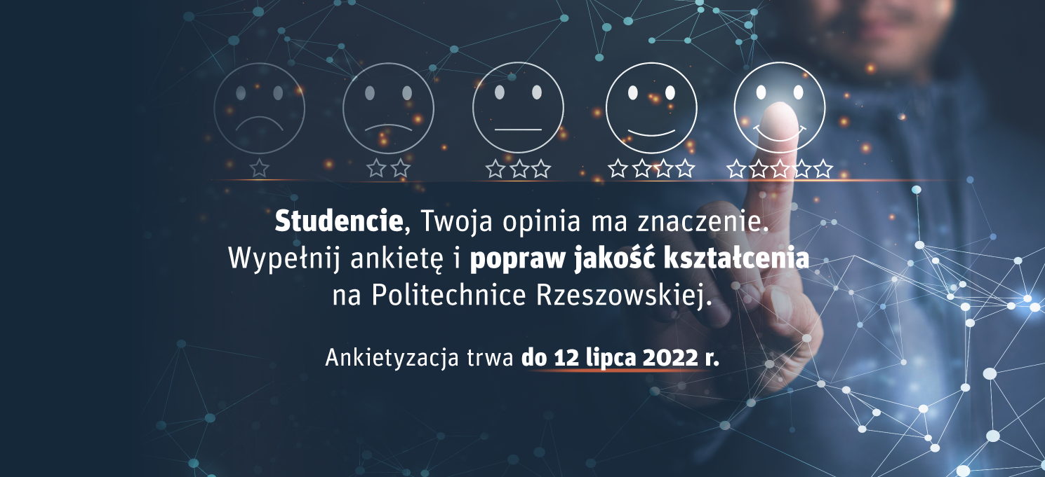 W dniach od 22 czerwca do 12 lipca 2022 r. na Politechnice Rzeszowskiej prowadzona jest ankietyzacja. Zachęcamy do wypełniania badań ankietowych. Lista dostępnych ankiet znajduje się na stronie DLA STUDENTÓW -> Ankiety lub w aplikacji Mobilny USOS PRz.