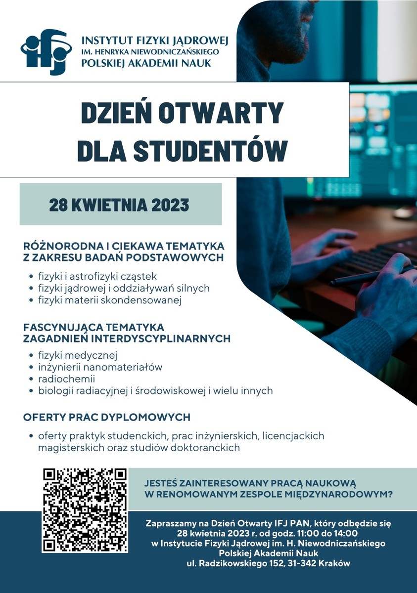 Dyrektor Instytutu Fizyki Jądrowej im. H. Niewodniczańskiego Polskiej Akademii Nauk serdecznie zaprasza na Dzień Otwarty dla studentów, który odbędzie się 28 kwietnia 2023 r. od godz. 11:00 do 14:00. Instytut znajduje się w Krakowie przy ul. Radzikowskiego 152.