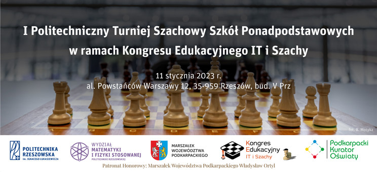 Serdecznie zapraszamy do wzięcia udziału w I Politechnicznym Turnieju Szachowym, który odbędzie się w dniu 11.01.2022 roku w Politechnice Rzeszowskiej przy al. Powstańców Warszawy 12 w Rzeszowie. Organizatorami tego wydarzenia będzie Politechnika Rzeszowska oraz Fundacja Edukacyjna IT i Szachy przy wsparciu Podkarpackiego Kuratora Oświaty w Rzeszowie.