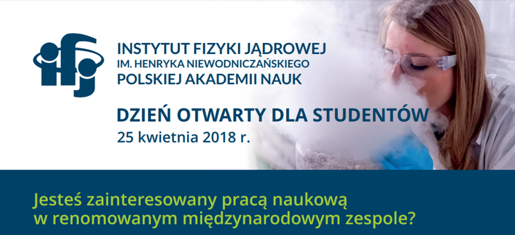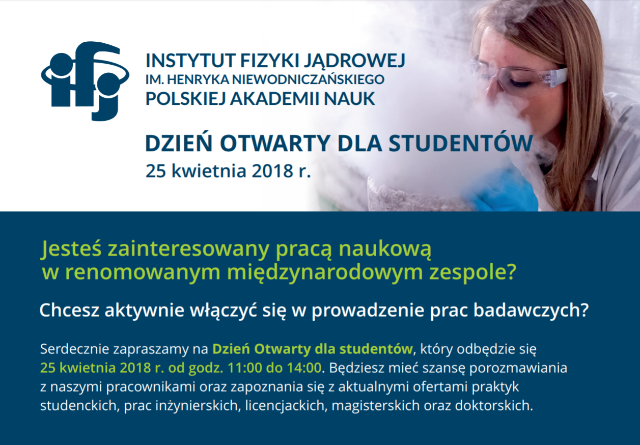 Instytut Fizyki Jądrowej PAN w Krakowie organizuje w dniu 25 kwietnia 2018 r od godz. 11.00 do godz. 14.00 "Dzień Otwarty IFJ PAN". Głównym celem przedsięwzięcia jest zainteresowanie studentów, którzy chcieliby odbywać praktyki lub pisać prace dyplomowe / licencjackie, inżynierskie, magisterskie a nawet doktorskie - pod okiem pracowników IFJ PAN we współpracy z Uczelnią macierzystą. Studenci którzy wezmą udział w dniach otwartych będą mieli szansę porozmawiania z ewentualnymi opiekunami oraz będą mogli zobaczyć sprzęt, który wykorzystywaliby w swojej pracy.