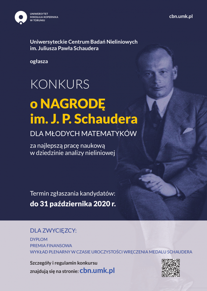 Uniwersyteckie Centrum Badań Nieliniowych im. J. P. Schaudera ogłasza konkurs o nagrodę im. Juliusza Pawła Schaudera dla młodych matematyków za najlepszą pracę naukową z dziedziny analizy nieliniowej.