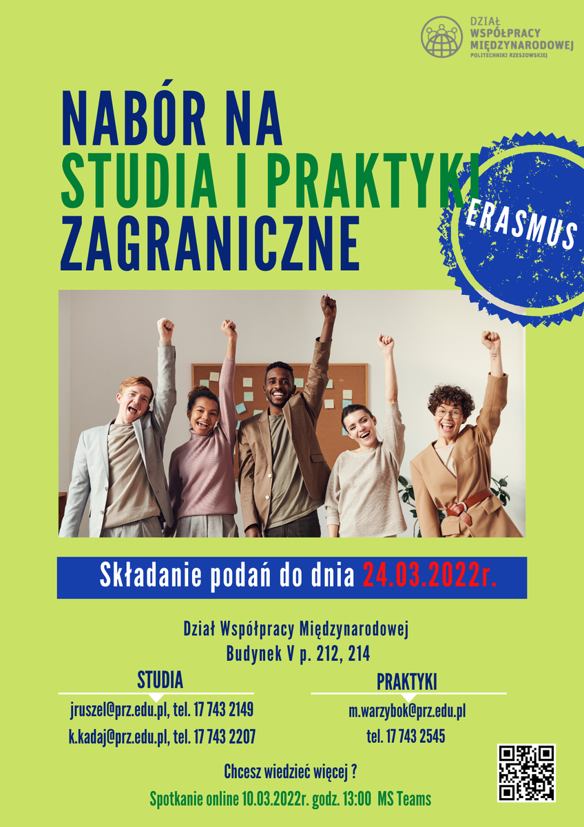Dział Współpracy Międzynarodowej Politechniki Rzeszowskiej zaprasza wszystkich zainteresowanych studentów do wzięcia udziału w rekrutacji na wyjazd na studia i praktykę za granicą .
