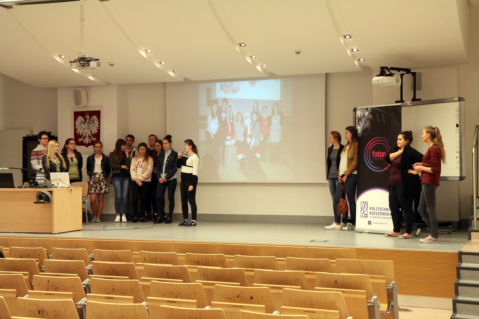 Po bardzo ciekawym wykładzie nastąpiła prezentacja najdłużej działającego koła naukowego przy WMiFS, mianowicie Koła Naukowego FOTON. Opiekunem tego koła jest kierownik Zakładu Optyki Stosowanej dr hab. inż. Tomasz Więcek, prof. PRz. Podczas prezentacji multimedialnej członkowie koła opowiedzieli o różnych aktywnościach związanych z działalnością w kole: czynnym udziale w konferencjach, pokazach fizycznych oraz różnych wydarzeniach kulturalnych. Członkowie zachęcali studentów do dołączenia do koła i przedstawili plan jego dalszej działalności.