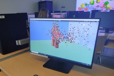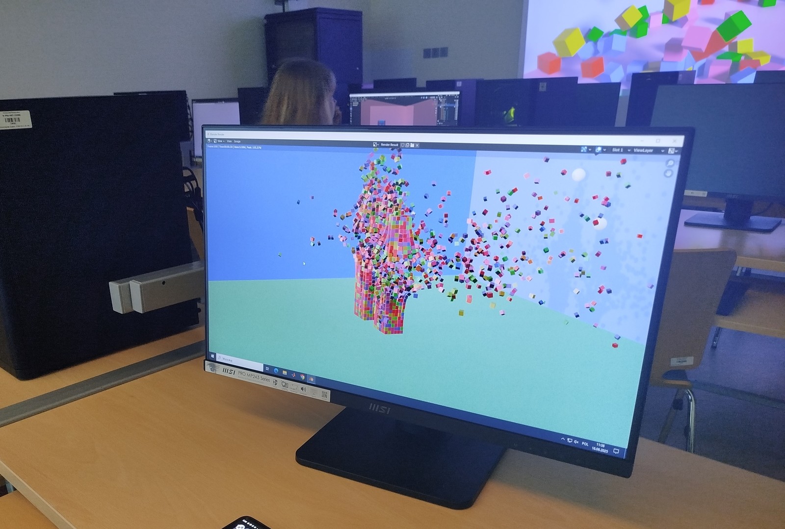 Pierwsze z zajęć, „Animacja i symulacja w Blenderze”, prowadzone przez dr inż. Wiktorię Wojnarowską, wprowadziły uczestników w świat grafiki komputerowej i animacji 3D. Uczniowie poznali podstawy działania silnika fizyki typu Rigid Body w środowisku Blender i stworzyli dynamiczną scenę burzenia wieży z kostek przez rozpędzoną kulę.