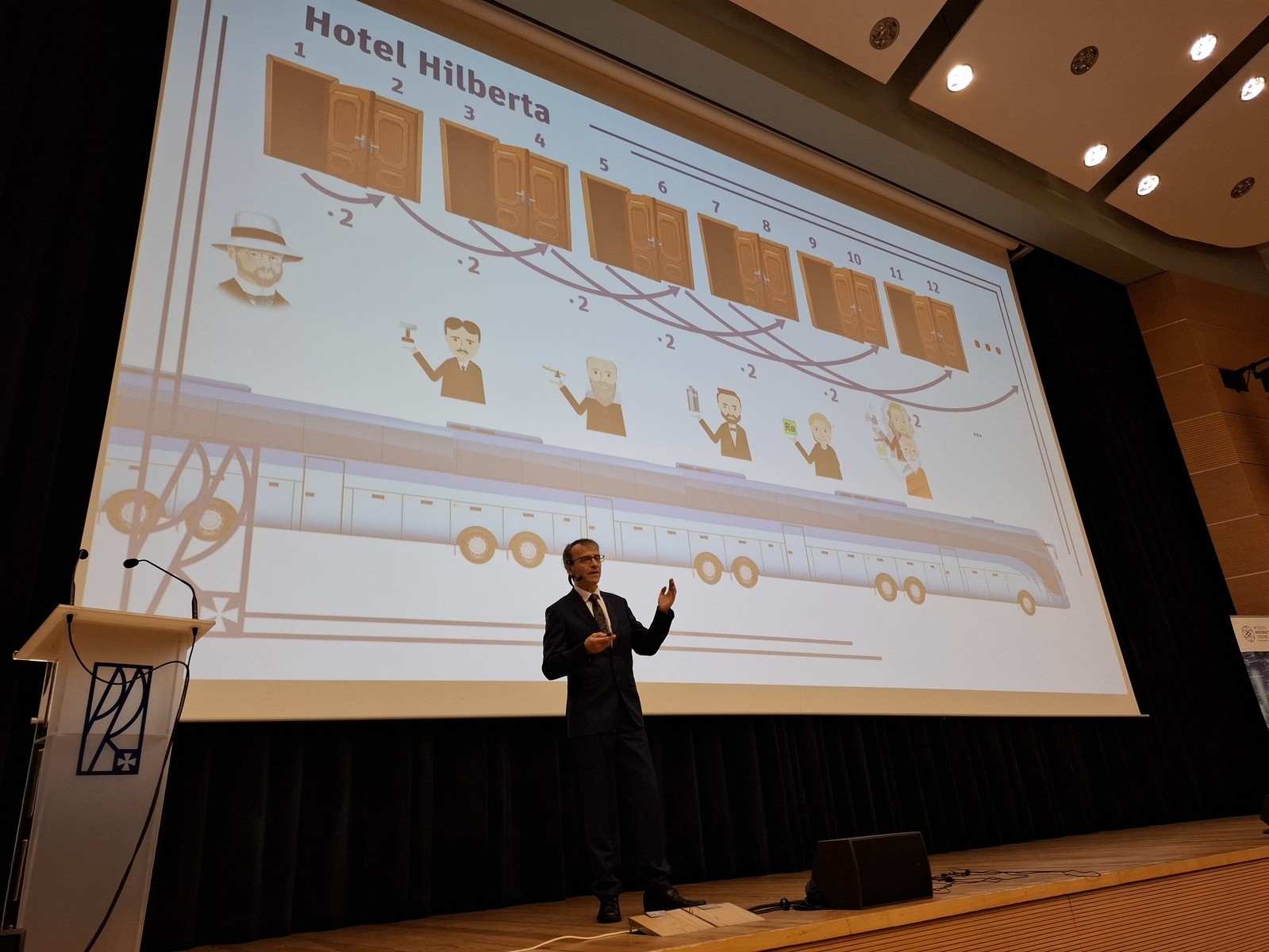 Wykład inauguracyjny pt. Zrozumieć niewyobrażalne, czyli w poszukiwaniu nieskończoności wygłosił dr Krzysztof Piejko. W przystępny i inspirujący sposób przedstawił on, jak już od czasów starożytnych próbowano zrozumieć tajemnicze pojęcie nieskończoności. Omówił znane paradoksy oraz pokazał, jak można je wyjaśnić przy użyciu analizy matematycznej, np. poprzez skończoną sumę szeregów nieskończonych. Na ciekawych przykładach wyjaśnił różnicę między nieskończonością potencjalną a aktualną oraz pokazał, jak porównywać zbiory nieskończone, wykorzystując pojęcie równoliczności zbiorów, np. dla zbioru liczb naturalnych i zbioru liczb naturalnych parzystych.