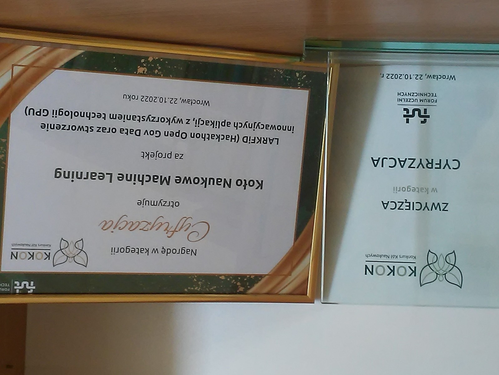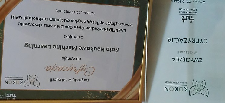 Koło Naukowe Machine Learning zdobyło pierwszą nagrodę w kategorii Cyfryzacja za projekt „LARKFiD (Hackathon Open Gov Data oraz stworzenie innowacyjnych aplikacji, z wykorzystaniem technologii GPU)”. Nagroda ta została przyznana podczas uroczystej Gali Finałowej, która odbyła się 22 października 2022r. w Strefie Kultury Studenckiej Politechniki Wrocławskiej.