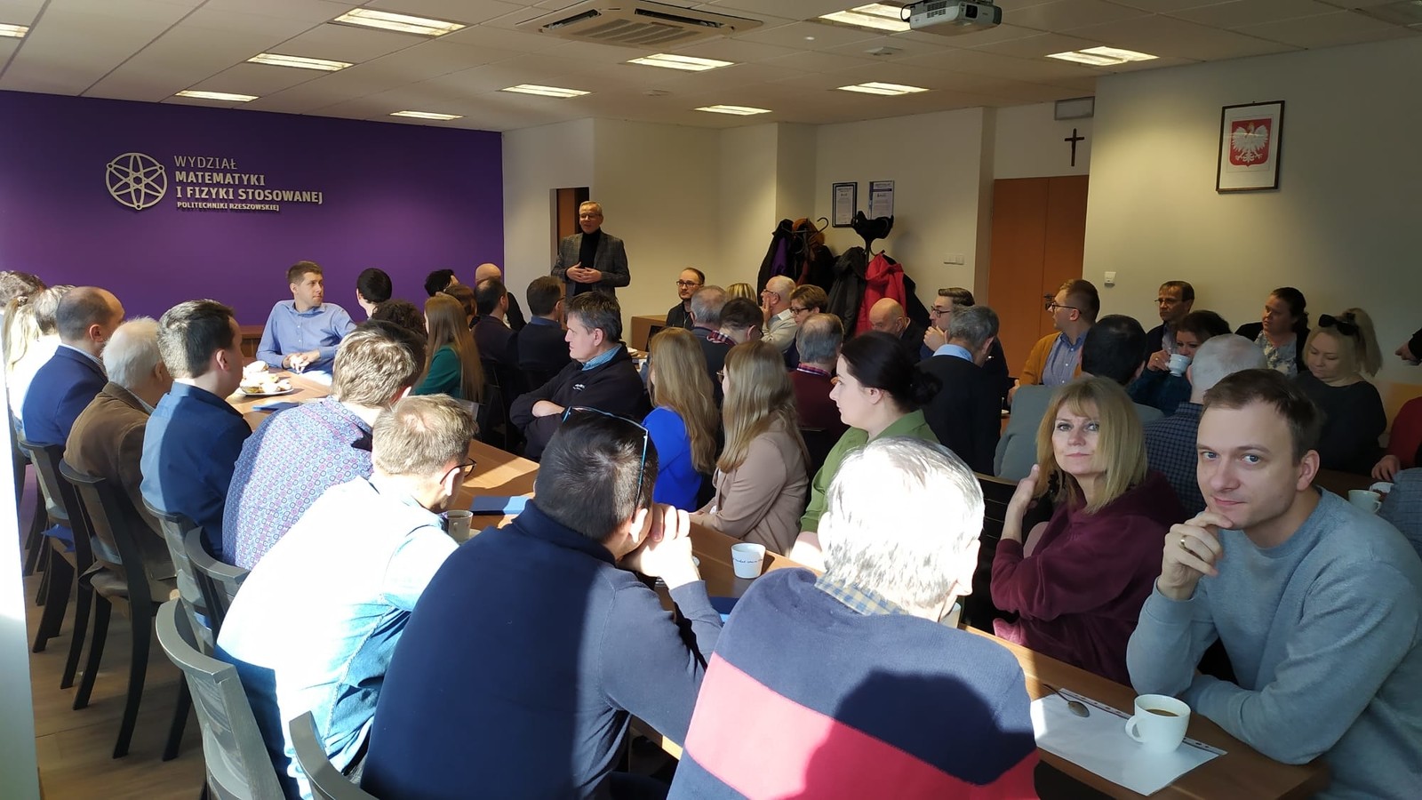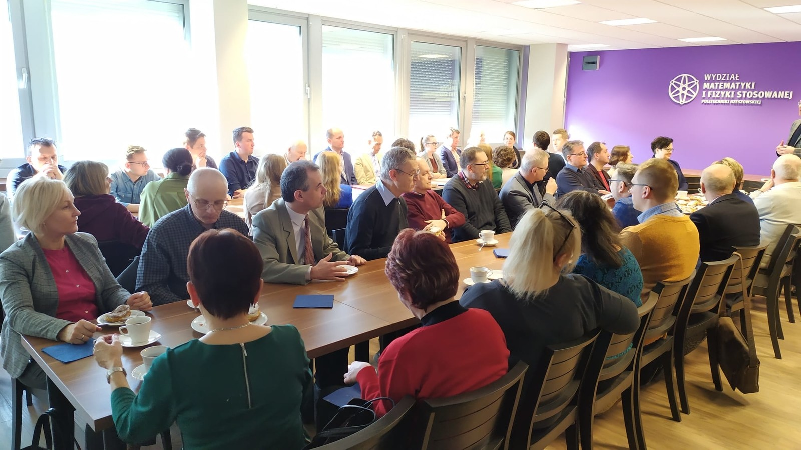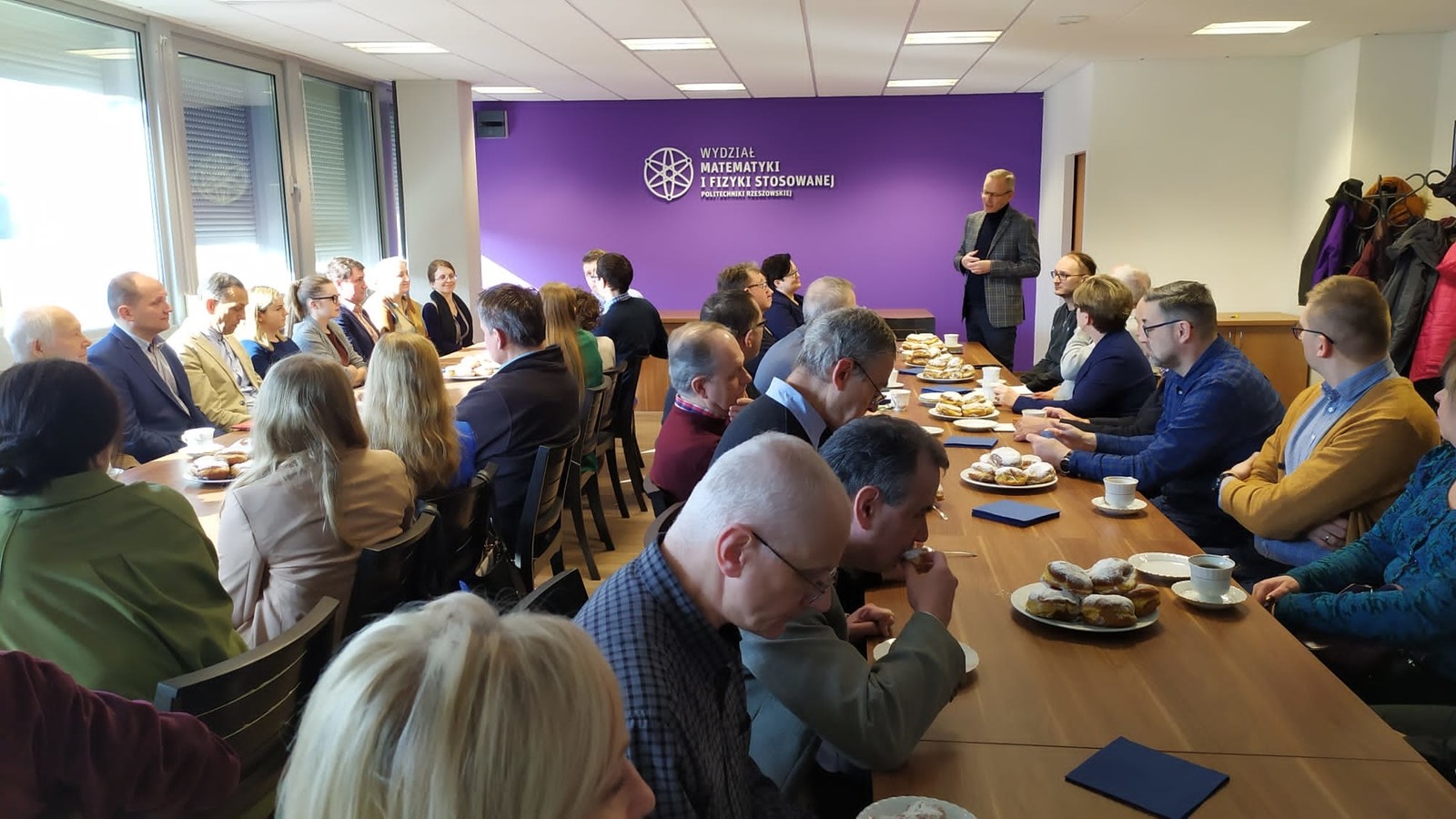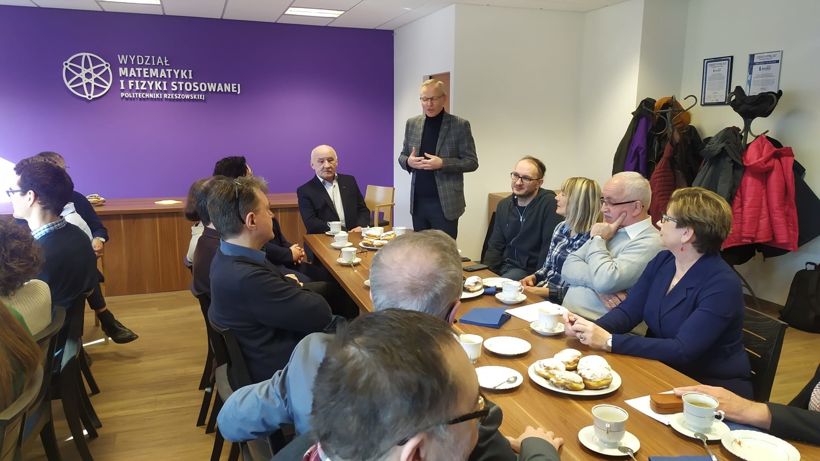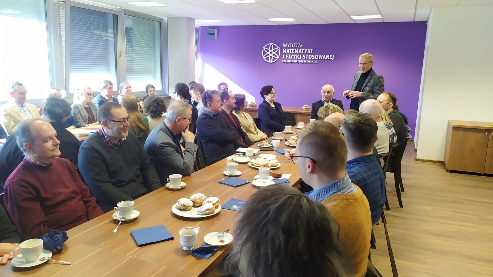 W dniu 16.02.2023 r. odbyło się spotkanie pracowników Wydziału MiFS z Prorektorem ds. nauki Politechniki Rzeszowskiej dr hab. inż. Lesławem Gniewkiem, prof. PRz. Spotkanie poświęcone było minionej i przyszłej ewaluacji w dyscyplinach reprezentowanych na wydziale. Było także okazją do świętowania kategorii B+ uzyskanych na wydziale w dyscyplinach matematyka i fizyka. Pan Prorektor podkreślił ogrom pracy wykonany w okresie minionej ewaluacji zarówno przez pracowników wydziału jak i pracowników administracyjnych, co jeszcze bardziej pozwala docenić uzyskane kategorie. Zachęcił również pracowników do równie wytężonej pracy w kolejnej ewaluacji.