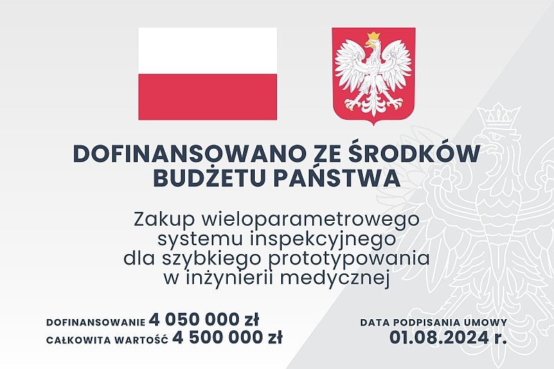 W dniu 01.08.2024 r. została podpisana umowa z Ministerstwem Nauki i Szkolnictwa Wyższego na dofinansowanie kosztów realizacji inwestycji pn. „Zakup wieloparametrowego systemu inspekcyjnego dla szybkiego prototypowania w inżynierii medycznej". Zakup będzie dofinasowany ze środków budżetu państwa w kwocie 4 050000 PLN, a całkowity koszty zakupu obejmuje 4,5mln PLN.