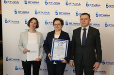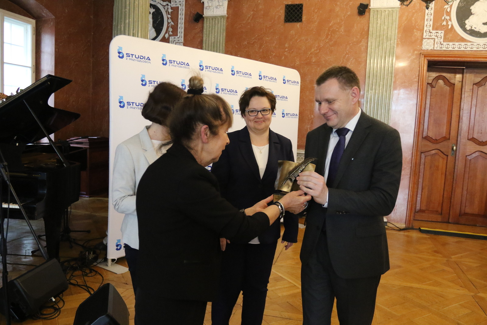 Dodatkowo nasz kierunek studiów został wyróżniony Certyfikatem Nadzwyczajnym „Lider Jakości Kształcenia”. Otrzymują go te spośród certyfikowanych kierunków, które zyskały najwyższą liczbę punktów rankingowych przyznanych przez członków Komisji Eksperckiej, oceniającej aplikacje w 7. Edycji Programu. Warto dodać, że to wyróżnienie uzyskało jedynie 8 na około 70 wyróżnionych kierunków czy specjalności studiów. Statuetkę i certyfikaty odebrali prodziekani WMiFS: dr Urszula Bednarz, dr Małgorzata Wołowiec-Musiał oraz dr Sławomir Wolski.
