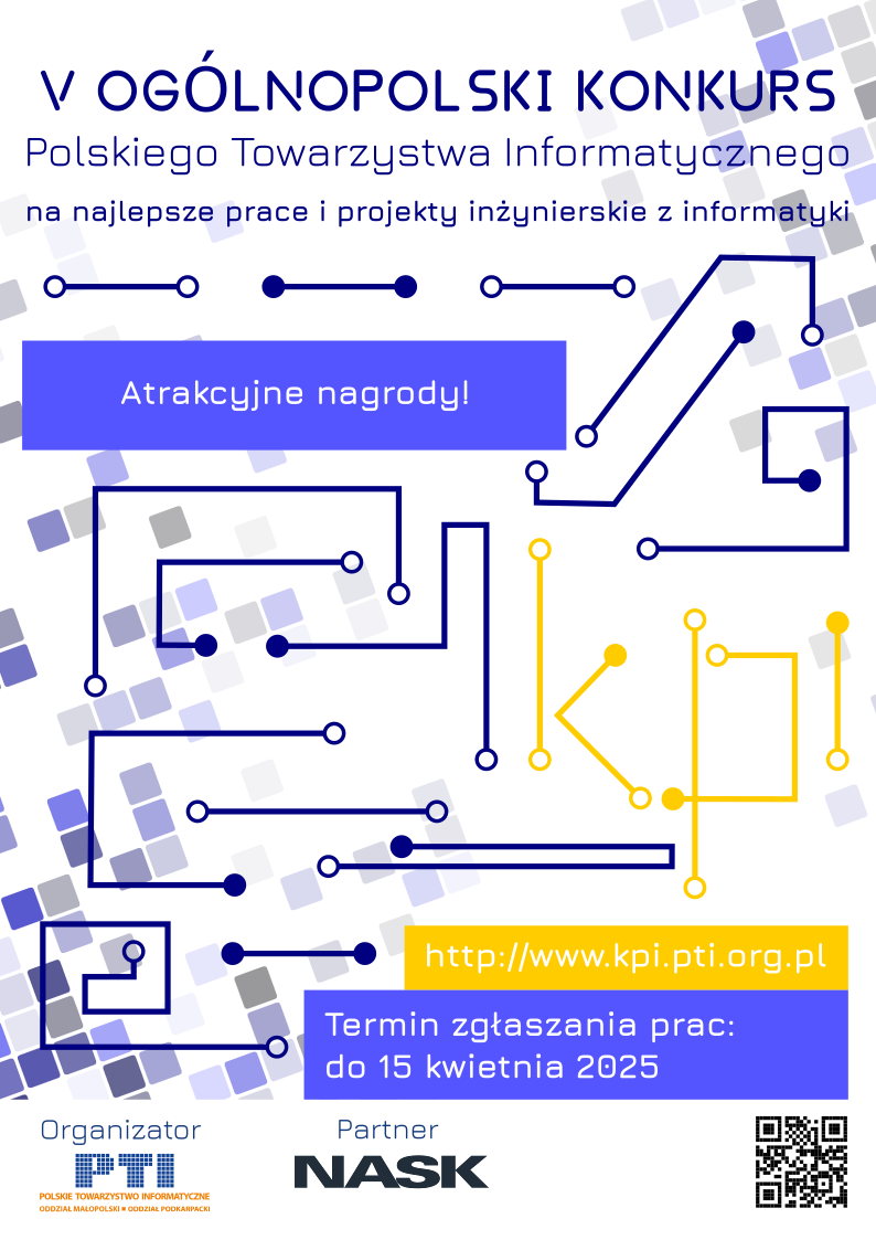 Polskie Towarzystwo Informatyczne już po raz piąty organizuje Ogólnopolski Konkurs na najlepsze prace i projekty inżynierskie z informatyki. Zapraszamy do zgłaszania projektów i prac inżynierskich oraz prac licencjackich ocenionych/obronionych w okresie od 16 lipca 2024 r. do 15 marca 2025 r. Termin nadsyłania zgłoszeń upływa 15 kwietnia 2025 r.