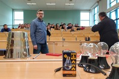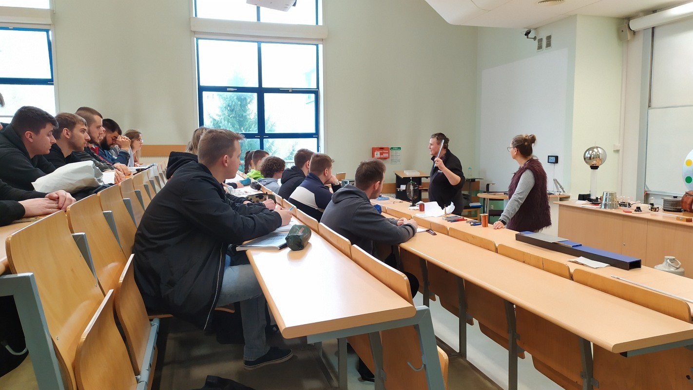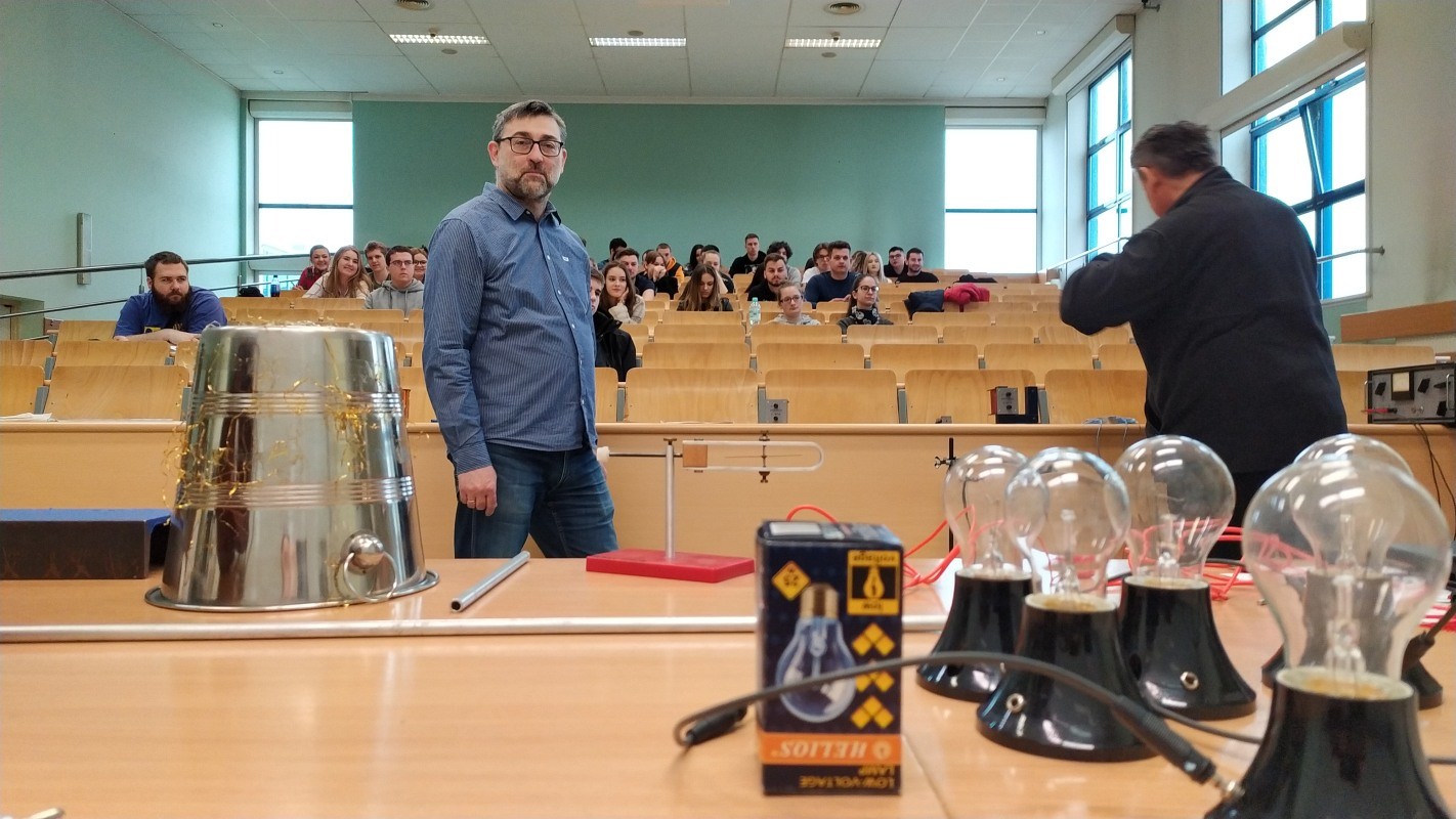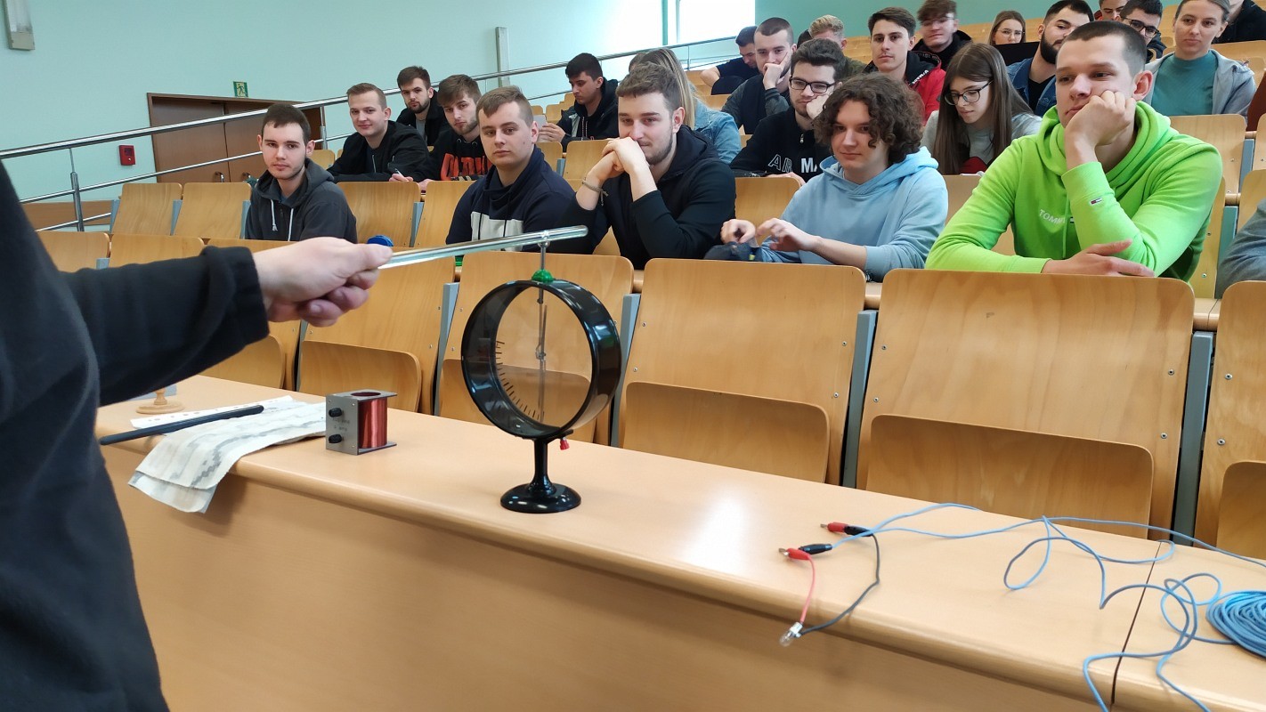 W kolejnym semestrze demonstracje zjawisk fizycznych zagościły na wykładach z fizyki dla studentów I roku Politechniki Rzeszowskiej. Podczas wprowadzonej od tego roku innowacji programowej studenci w praktyczny i atrakcyjny sposób są zaznajamiani ze zjawiskami fizycznymi. Ten czwarty z kolei cykl demonstracji dotyczył tym razem tematyki elektrostatyki, magnetyzmu oraz praw rządzących elektromagnetyzmem. Przeprowadzenie tego typu zajęć było możliwe dzięki zaangażowaniu prof. Tomasza Więcka oraz mgr inż. Bogdana Wosia w przygotowanie zestawów demonstracyjnych i wsparcie w zakresie prezentacji zjawisk. Ważnym elementem organizacyjnym dla tych zajęć było przeznaczenie sali S2 dla prowadzenie wykładów z fizyki – niestety dla regularnego wykorzystanie zestawów demonstracyjnych brakuje dedykowanego pomieszczenia na salę zbiorów.