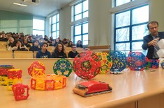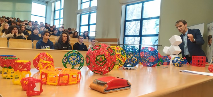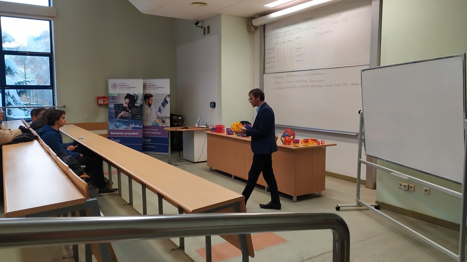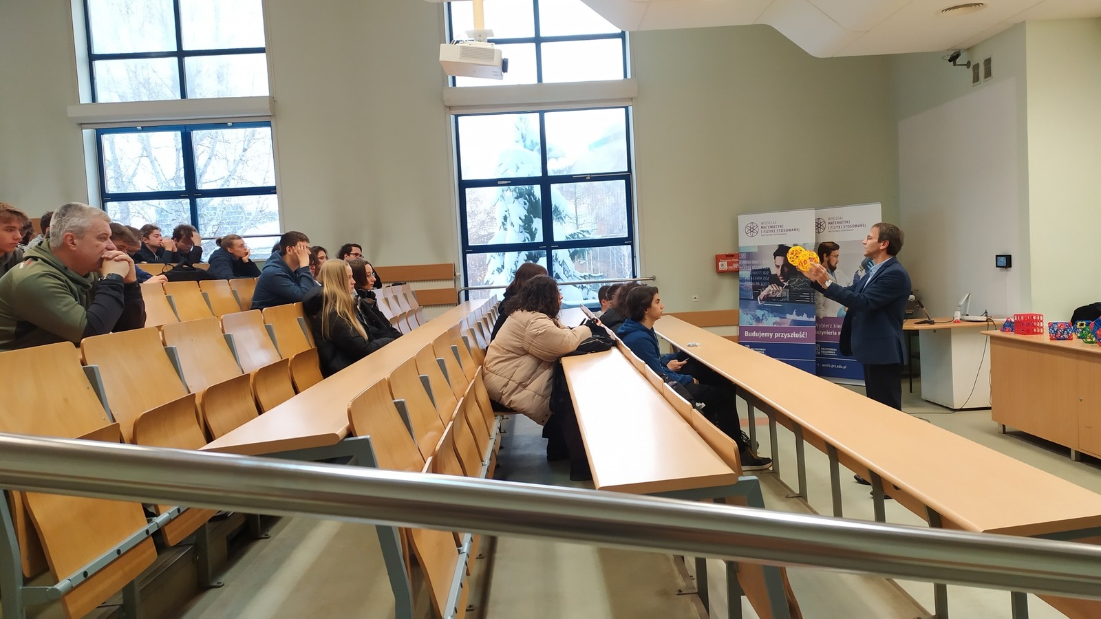14.12. odbyły się ostatnie w semestrze zimowym wykłady otwarte dla uczniów szkół średnich. Dr Krzysztof Piejko w sposób ciekawy opowiedział o świecie brył w wykładzie "Geometryczne piękno, czyli w świecie brył" używając kolorowych eksponatów. Dr Paweł Witowicz przybliżył sposoby dowodzenia nierówności, natomiast dr hab. Tomasz Więcek, prof. PRz zaprezentował "Nowe oblicze optyki - pokazy z fizyki". W wykładach uczestniczyła licznie zgromadzona młodzież z IV LO w Rzeszowie i II LO w Mielcu.
