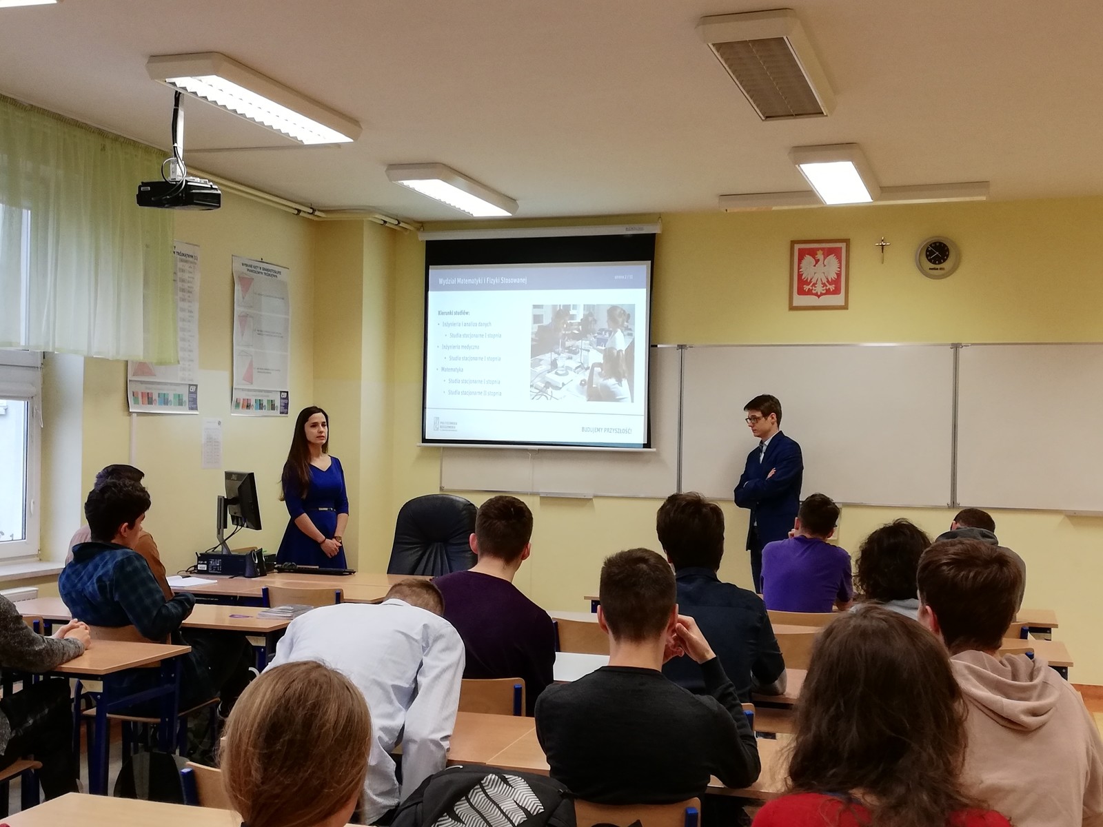 Każdej klasie została przedstawiona krótka prezentacja przygotowana wcześniej przez zespół zajmujący się promocją kierunków prowadzonych na wydziale. Aby zachęcić do studiowania inżynierii i analizy danych, inżynierii medycznej czy matematyki omówione zostały sylwetki absolwentów każdego kierunku oraz perspektywy zatrudnienia po ukończeniu studiów. Uczniowie z dużym zainteresowaniem wysłuchali prezentacji i mamy nadzieję, że część z nich już w październiku rozpocznie studia na jednym z wymienionych kierunków. Serdecznie zapraszamy!