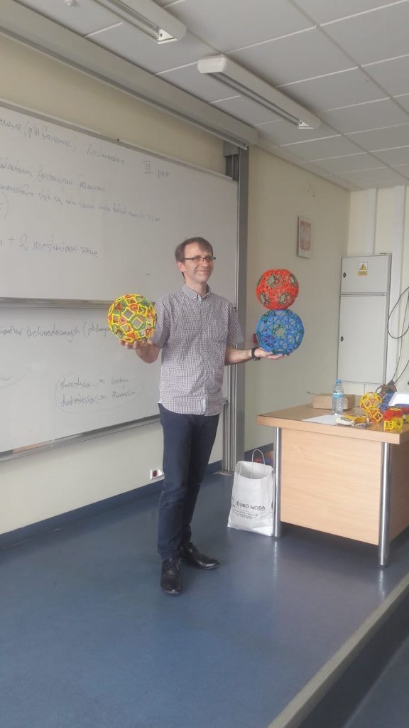 Podczas wykładu uczniowie zapoznali się z definicjami i niezwykłymi własnościami brył platońskich i archimedesowych oraz wielościanów Catalana. W czasie warsztatów mieli także możliwość obejrzenia oraz skonstruowania własnych brył z klocków reko. Mogli także samodzielnie wykonać pewien wielościan Catalana metodą origami i na tym modelu obserwować jego zaskakujące własności.